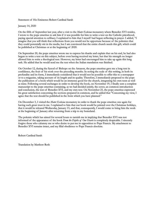 Pada tanggal yang sama, Kardinal Robert Sarah pun kemudian membuat pernyataan resmi terkait kontroversi yang menyertai penerbitan buku tersebut. Ia menyatakan telah bertemu dengan Paus Emeritus untuk memastikan kontroversi yang telah terjadi.